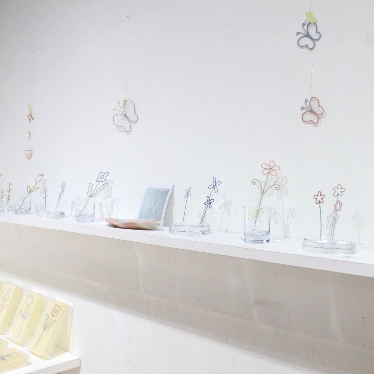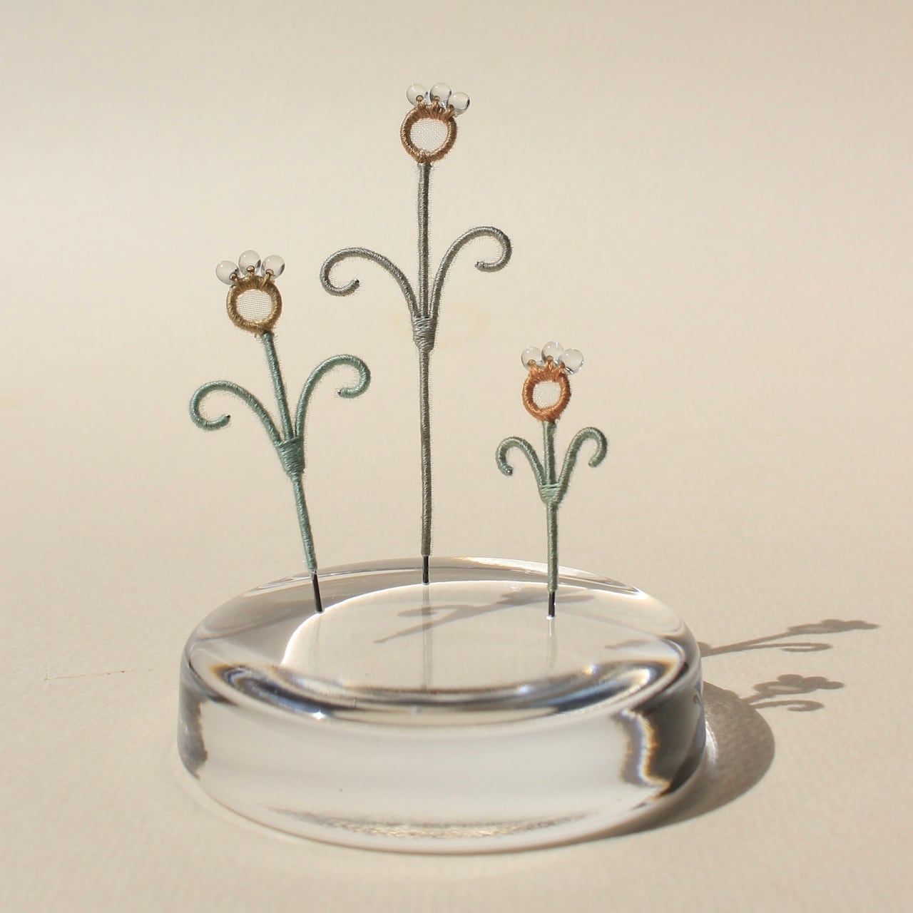 手縫いの刺繍で作られたお花を、ガラスに挿したオブジェです。