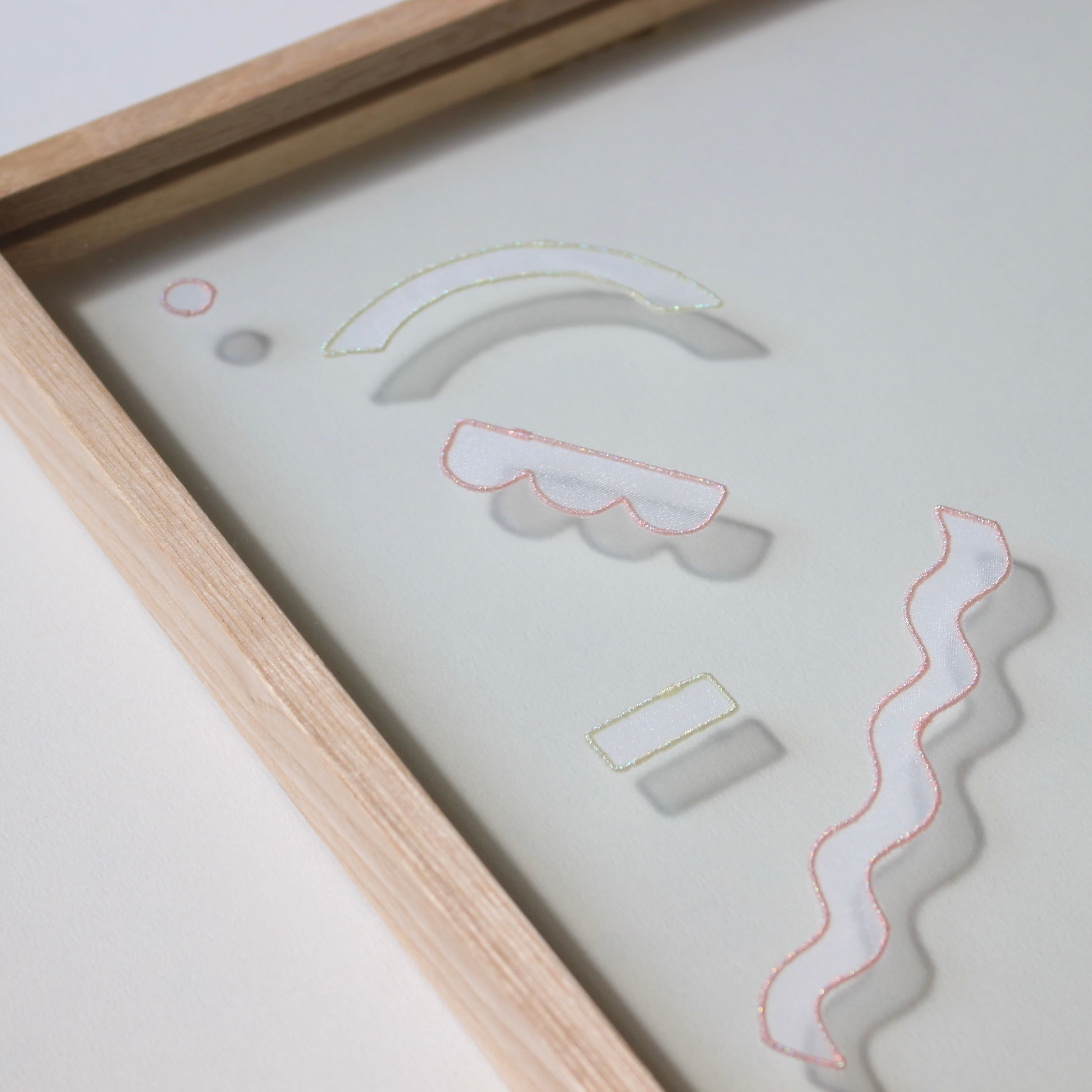 Stainless steel wire, polyester organza fabric, metallic embroidery thread (polyester), glass, wooden frame