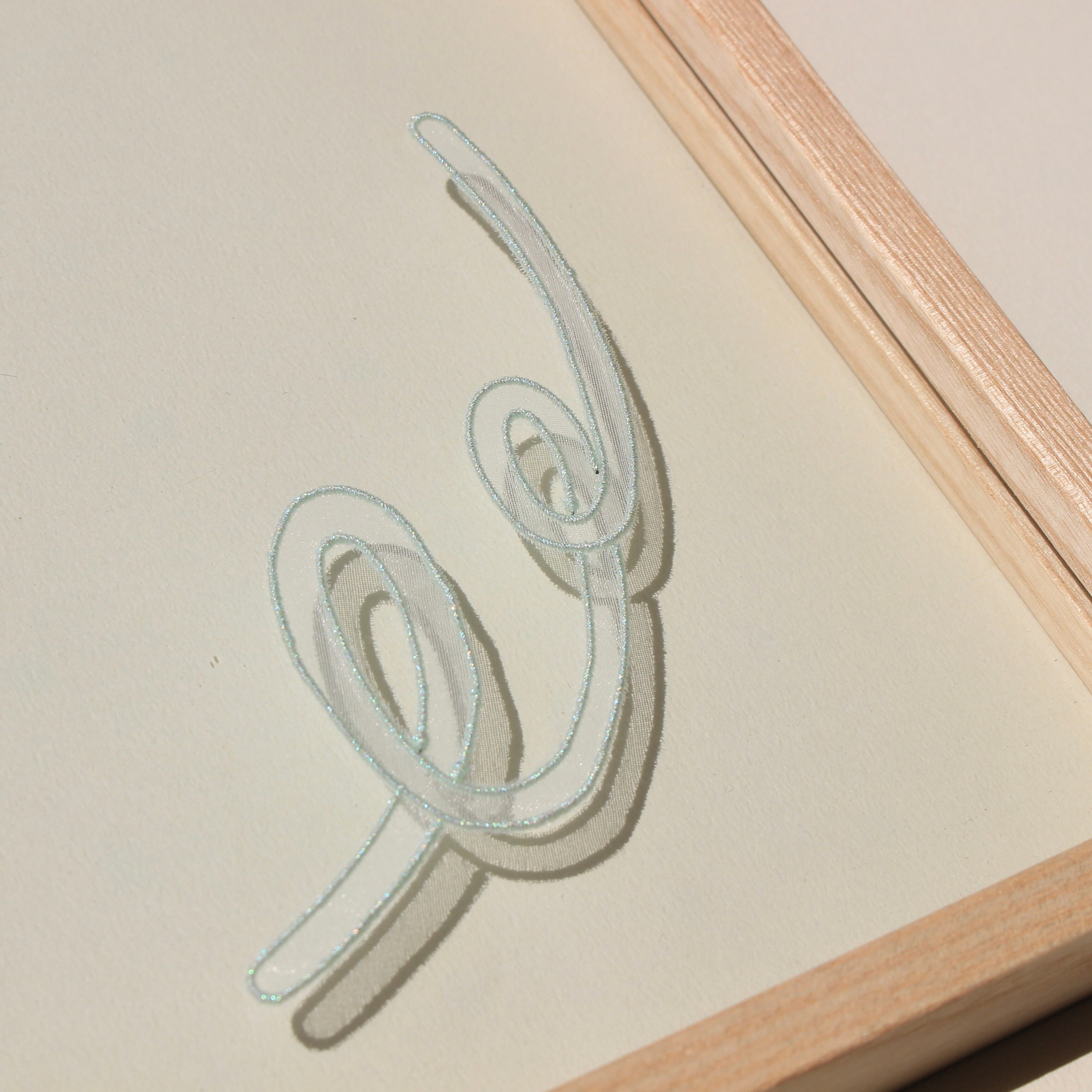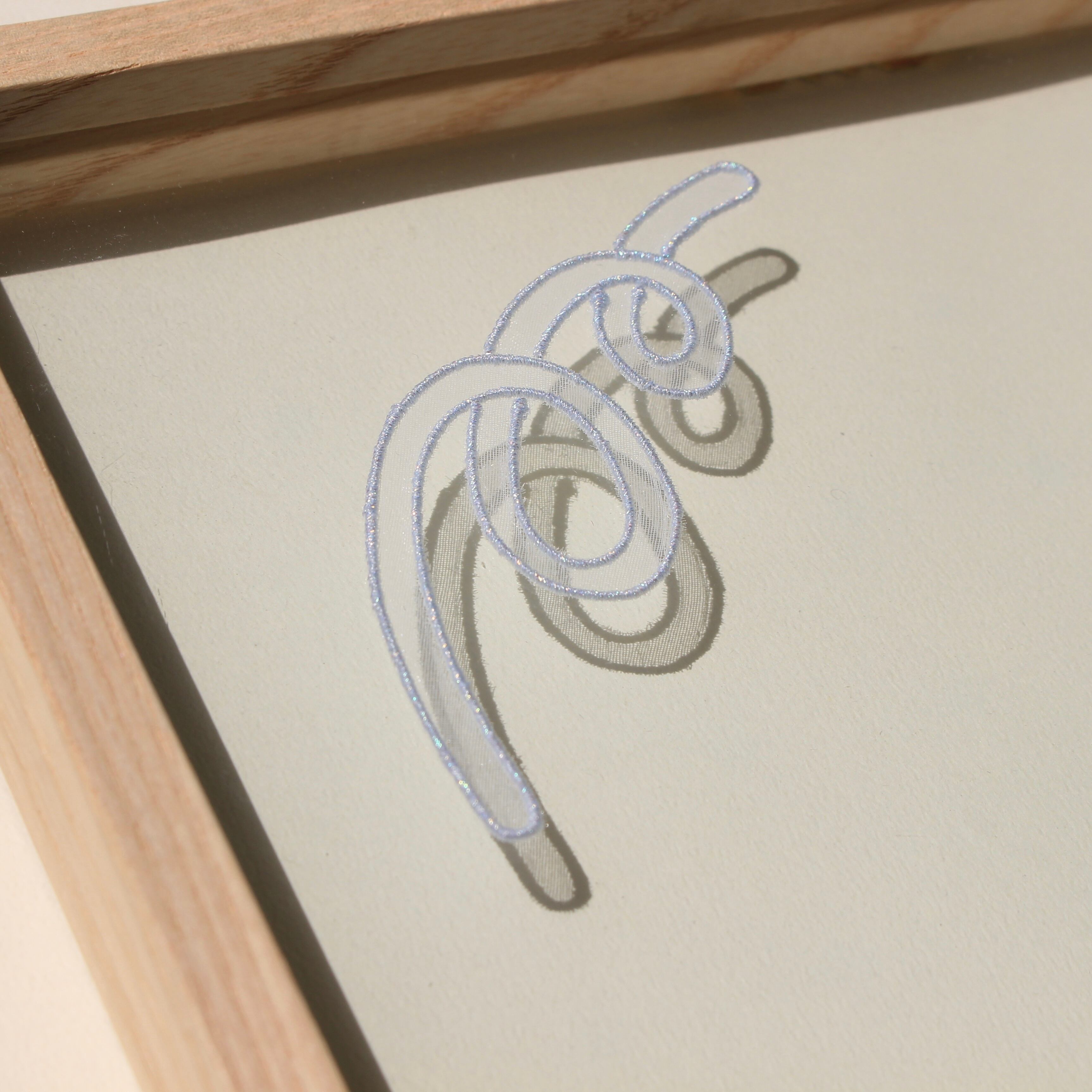 Stainless steel wire, polyester organza fabric, metallic embroidery thread (polyester), glass, wooden frame