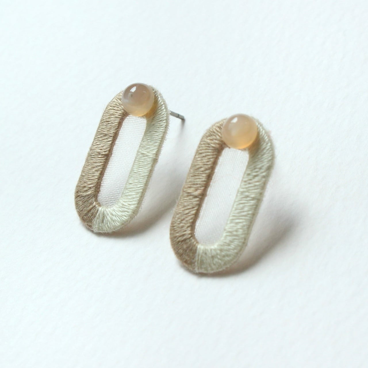 Pierced earrings: Polyester organza / Titanium posts / Cotton embroidery thread / Natural stone (moonstone)