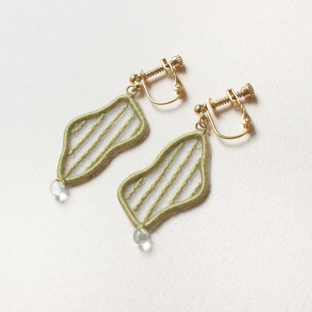 Clip-on earrings: Polyester organza / Gold plating / Cotton embroidery thread / Glass beads