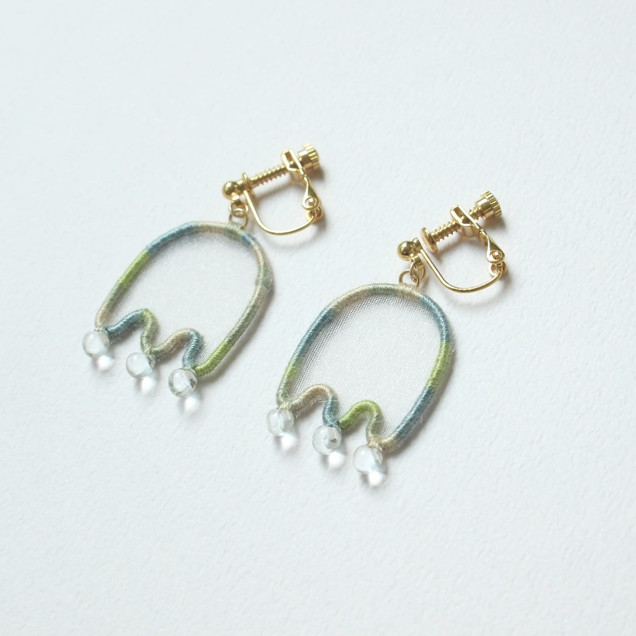 Clip-on earrings: Polyester organza / Gold plating / Cotton embroidery thread / Glass beads